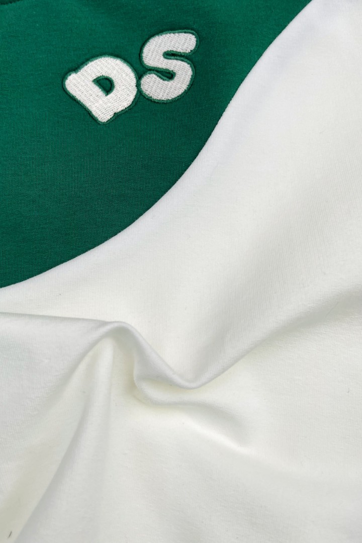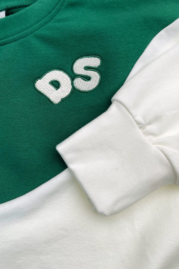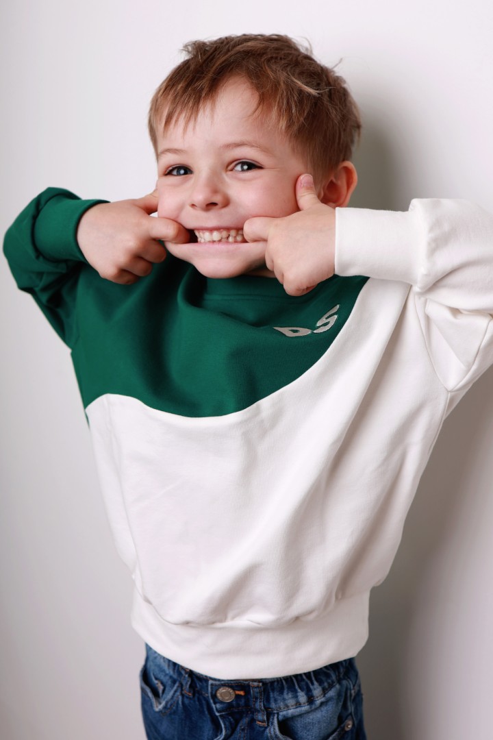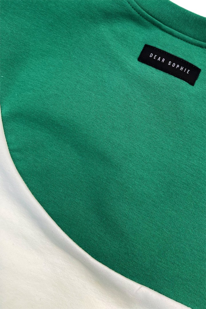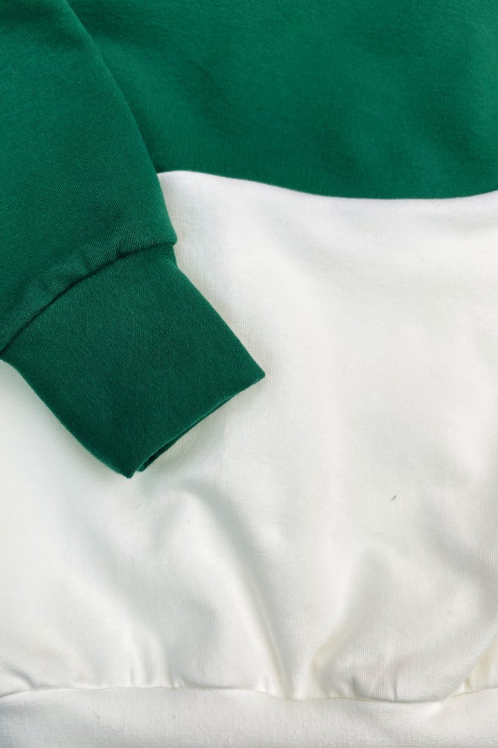 To jest bluza, która robi stylówkę sama z siebie. Nowy krój opiera się na asymetrycznym cięciu — zielona góra płynnie przechodzi w jasny dół, jakby ktoś narysował falę.