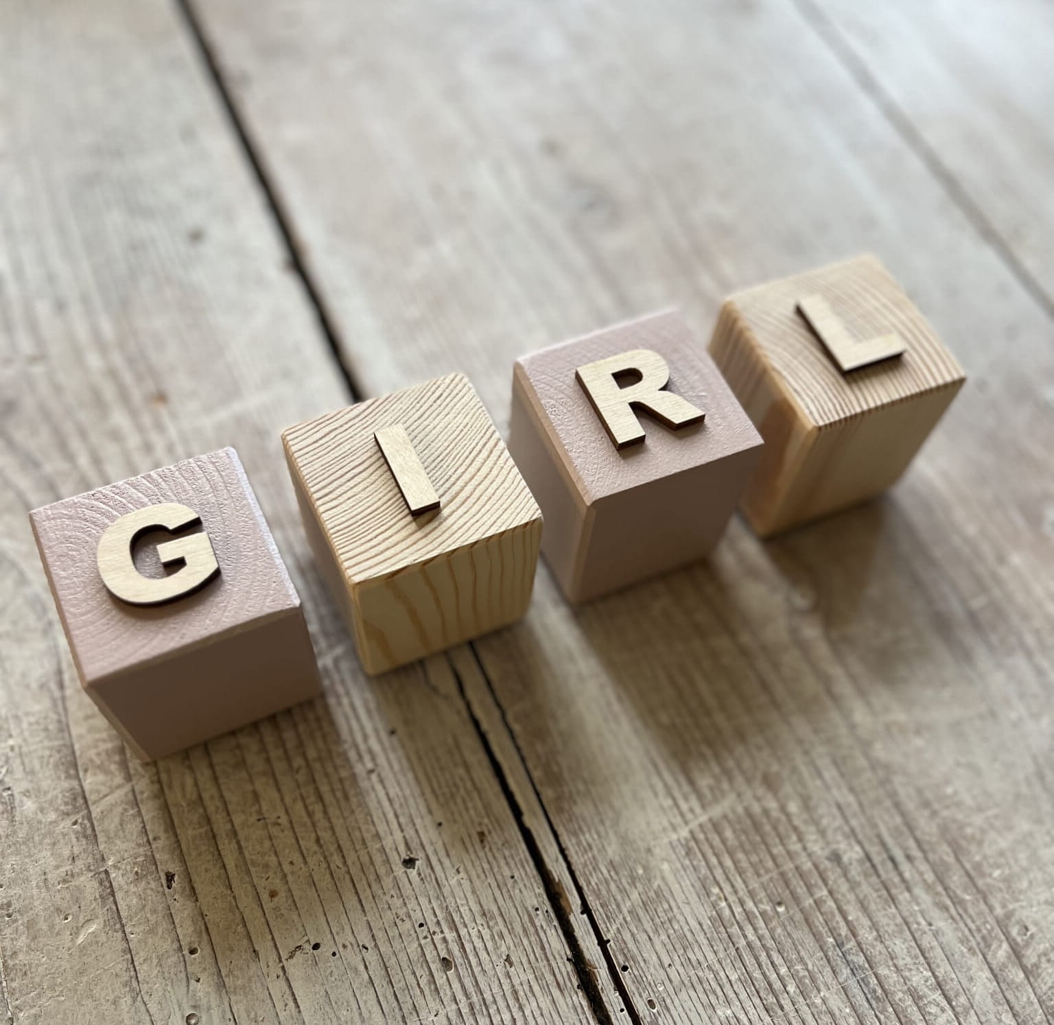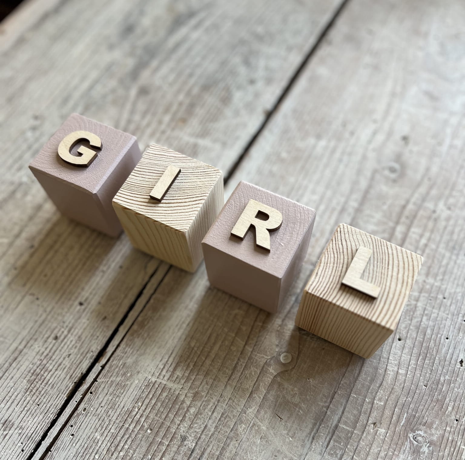 - W zestawie: 4 klocki z literami „G”, „I”, „R”, „L” w kolorze pudrowym i naturalnym