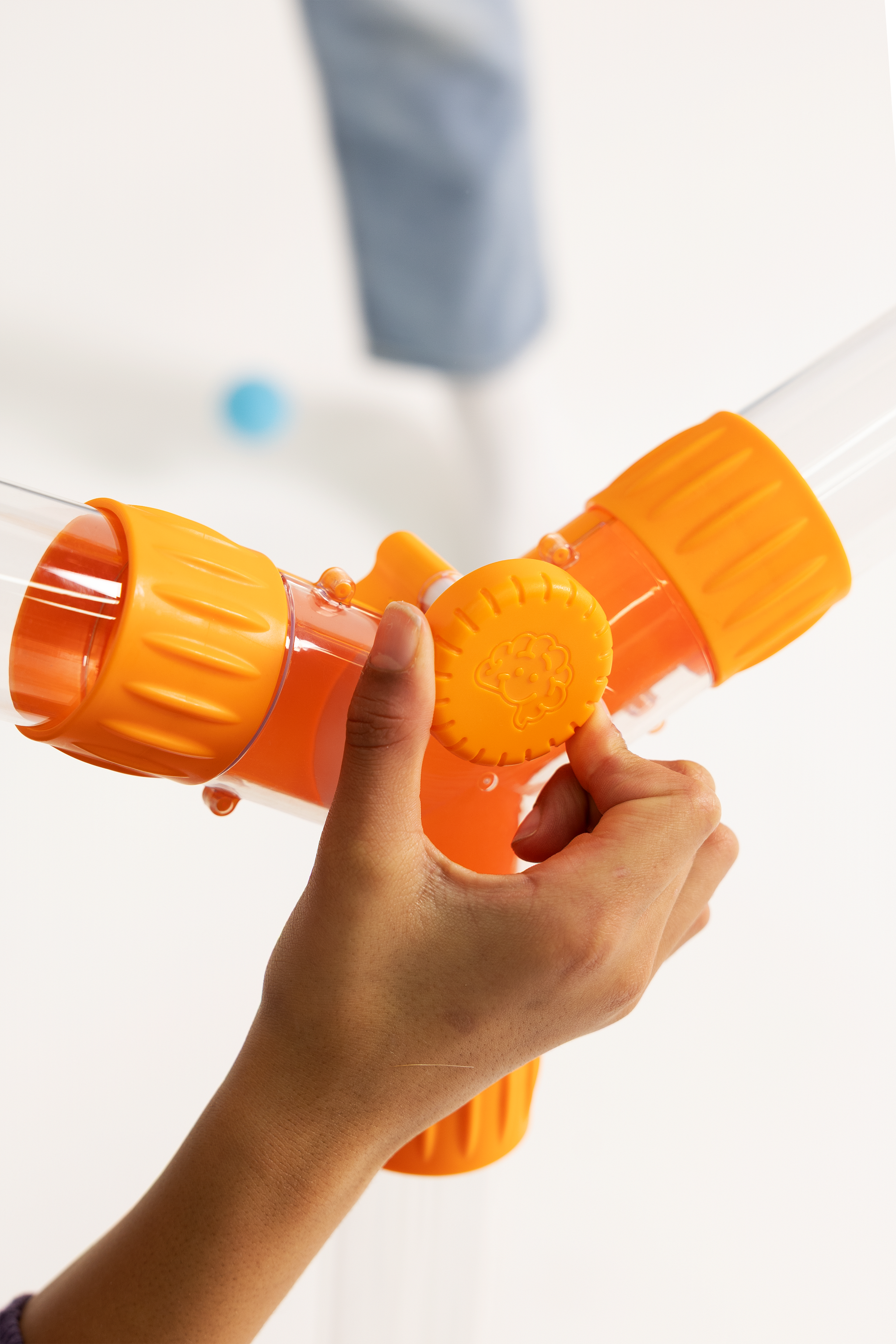 Obróć pokrętło, aby przestawić łopatkę i skierować kulki w lewo lub w prawo. Dzięki przełącznikowi skierujesz powietrze do wybranej trasy, umożliwiając zabawę na dwóch różnych torach. Dla dzieci w wieku 3+.