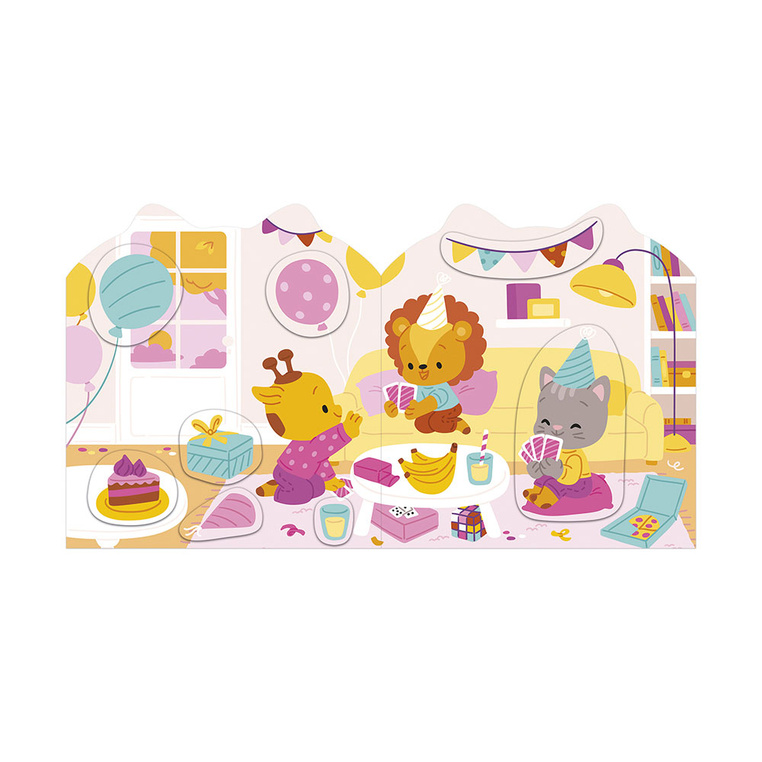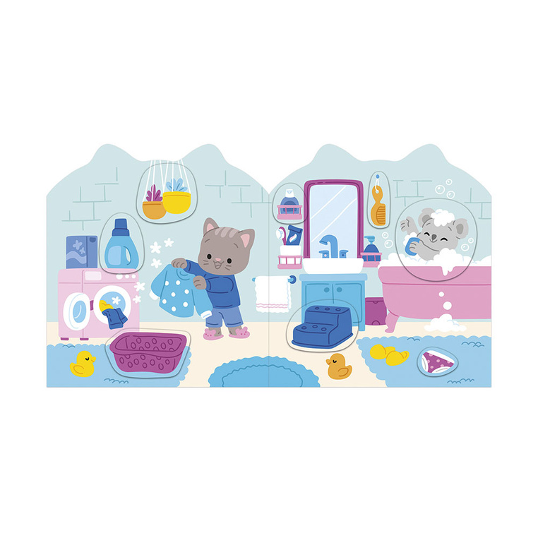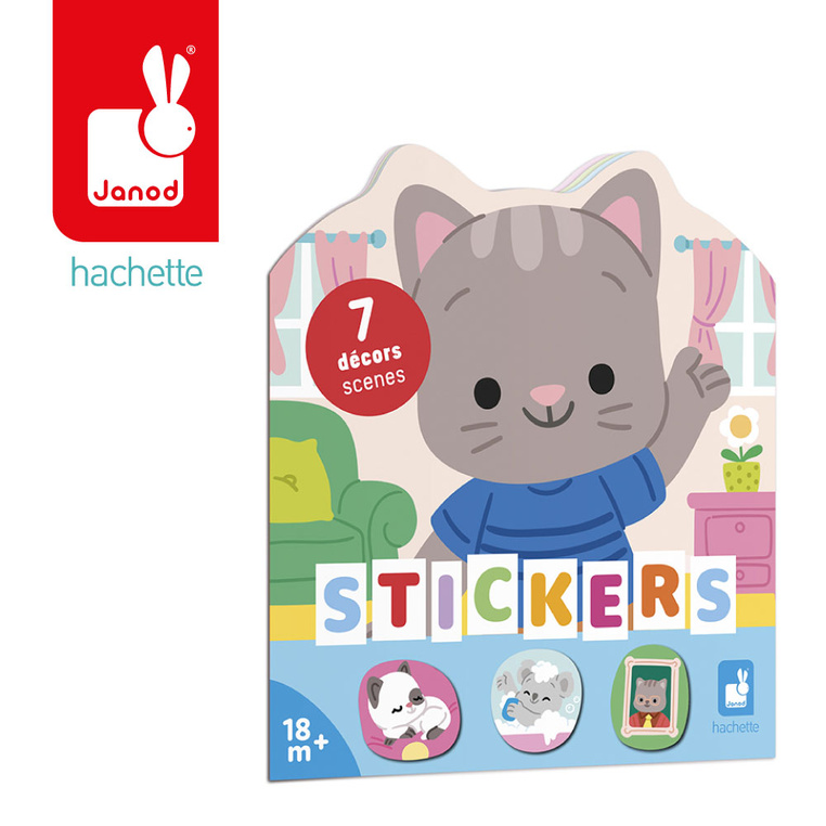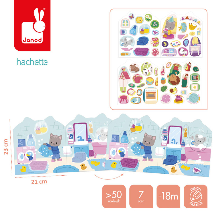 Książeczka do wyklejania z naklejkami Dom francuskiej marki JANOD. Książeczka zawiera wewnątrz 7 różnych scen z pustymi miejscami do wypełnienia naklejkami. Dziecko może śledzić losy bohatera – szarego kotka – podczas jego codziennych aktywności, opowiadać o nich i jednocześnie samodzielnie uzupełniać ilustracje załączonymi do książki naklejkami (ponad 50 szt.).