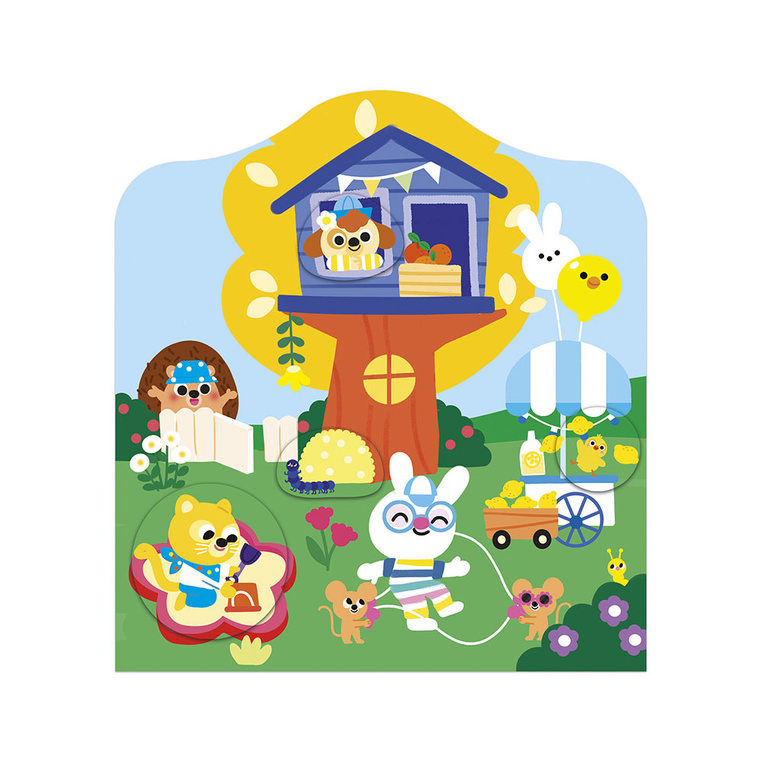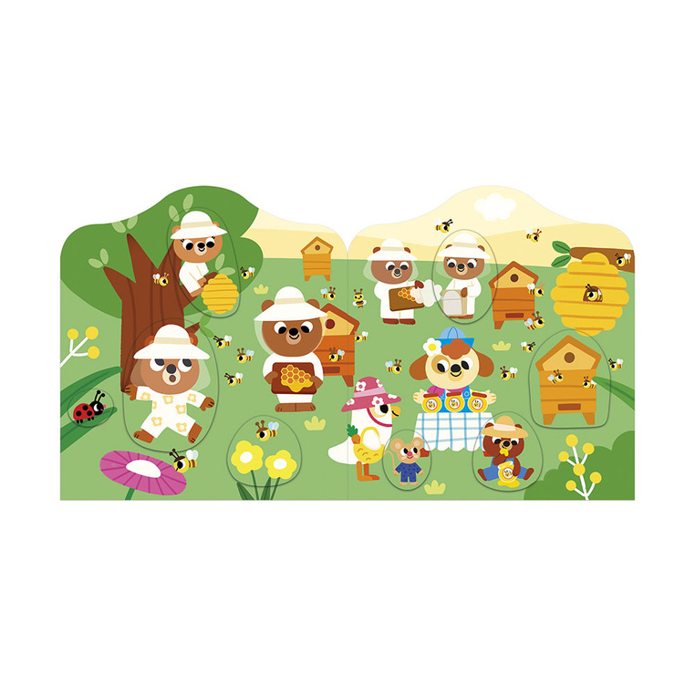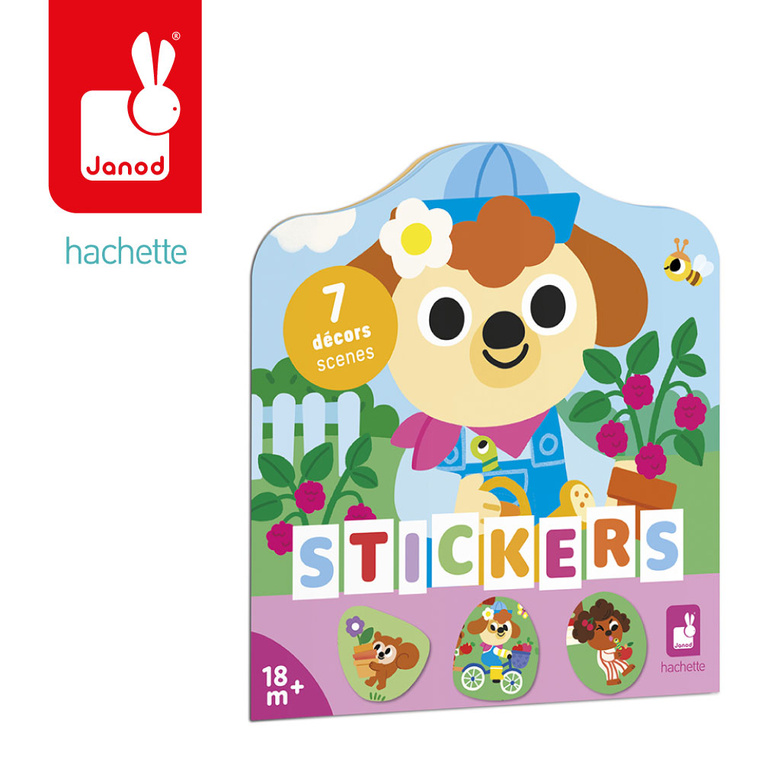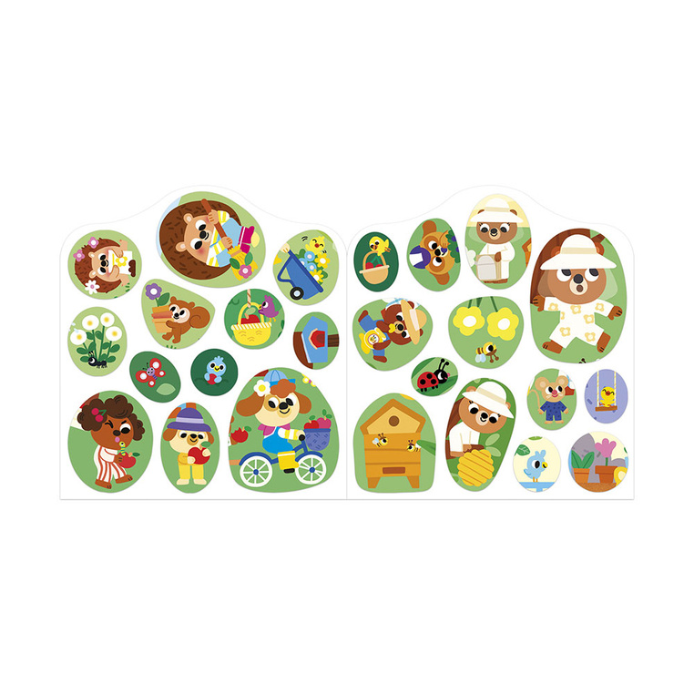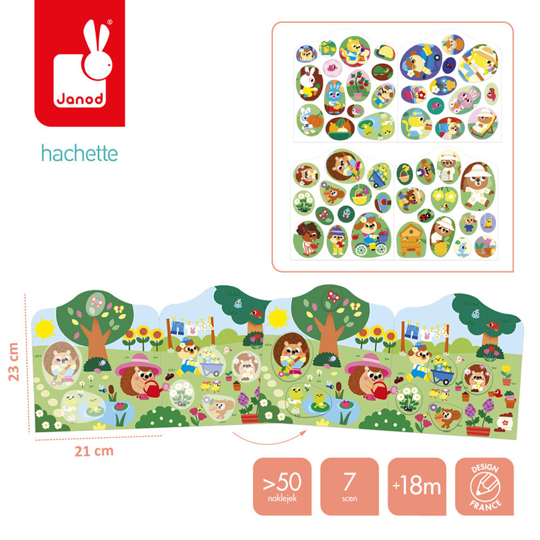 Książeczka do wyklejania z naklejkami Ogród francuskiej marki JANOD. Książeczka zawiera wewnątrz 7 różnych scen z pustymi miejscami do wypełnienia naklejkami. Dziecko może śledzić losy bohaterów opowieści – zwierzątek ogrodników – opowiadać o nich i jednocześnie samodzielnie uzupełniać ilustracje załączonymi do książki naklejkami (ponad 50 szt.).