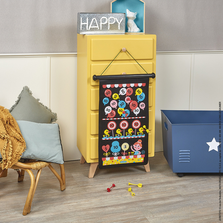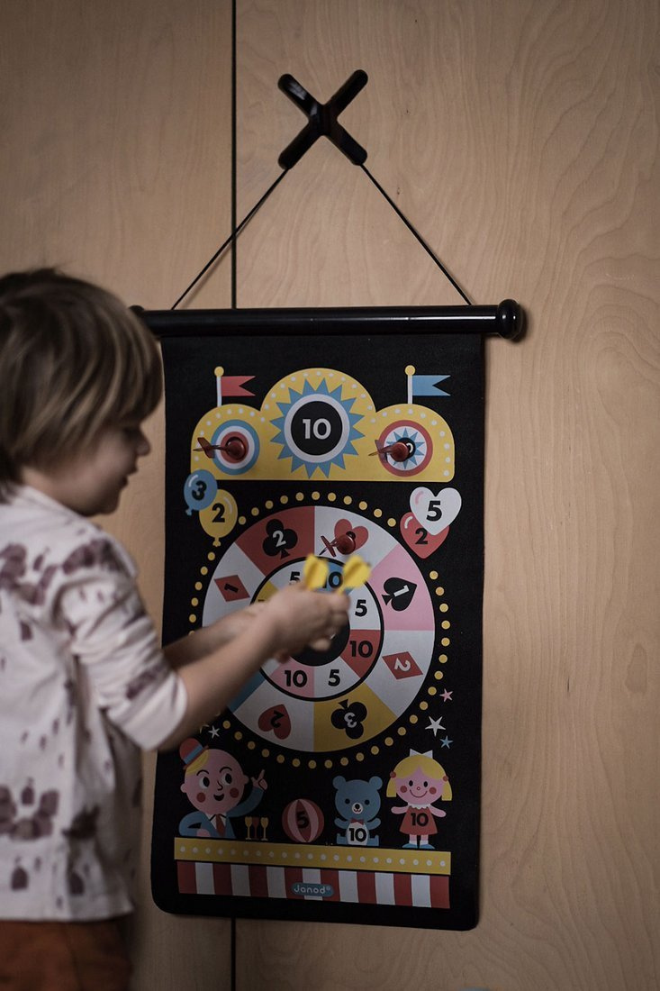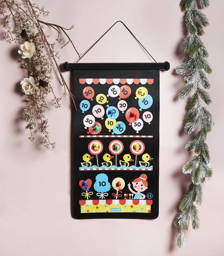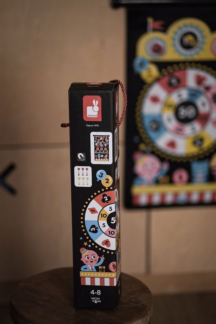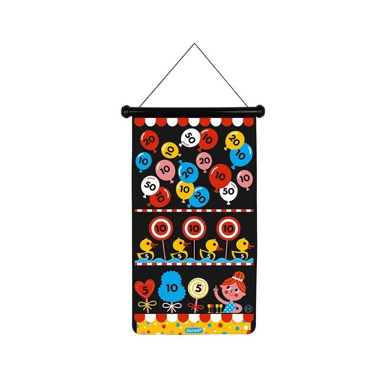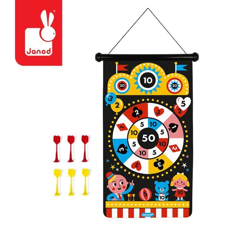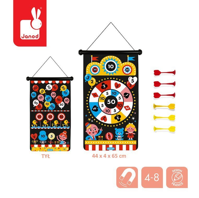 Magnetyczna gra w rzutki Wesołe miasteczko francuskiej marki JANOD to wspaniała zabawa dla dwojga – zarówno dzieci, jak i ich rodziców. Zestaw składa się ze zwijanej na rolkę tarczy ze sznurkiem do jej zawieszenia, np. na ścianie, oraz z 6 magnetycznych rzutek w dwóch kolorach (3 czerwone i 3 żółte). Czarna tkanina tarczy ilustrowana jest dwustronnie kolorowymi motywami typowymi dla strzelnicy z wesołego miasteczka, m. in balonami, kaczuszkami czy kołem fortuny. Rzutkami należy celować w tarczę z odpowiedniej, ustalonej przez graczy odległości, w taki sposób, by trafić w oznaczone na niej punktowane miejsca. Celem gry jest zgromadzenie w trzech rzutach jak największej ilości punktów. Gracz, któremu się to uda, wygrywa. Gra ta ćwiczy koncentrację i zręczność.