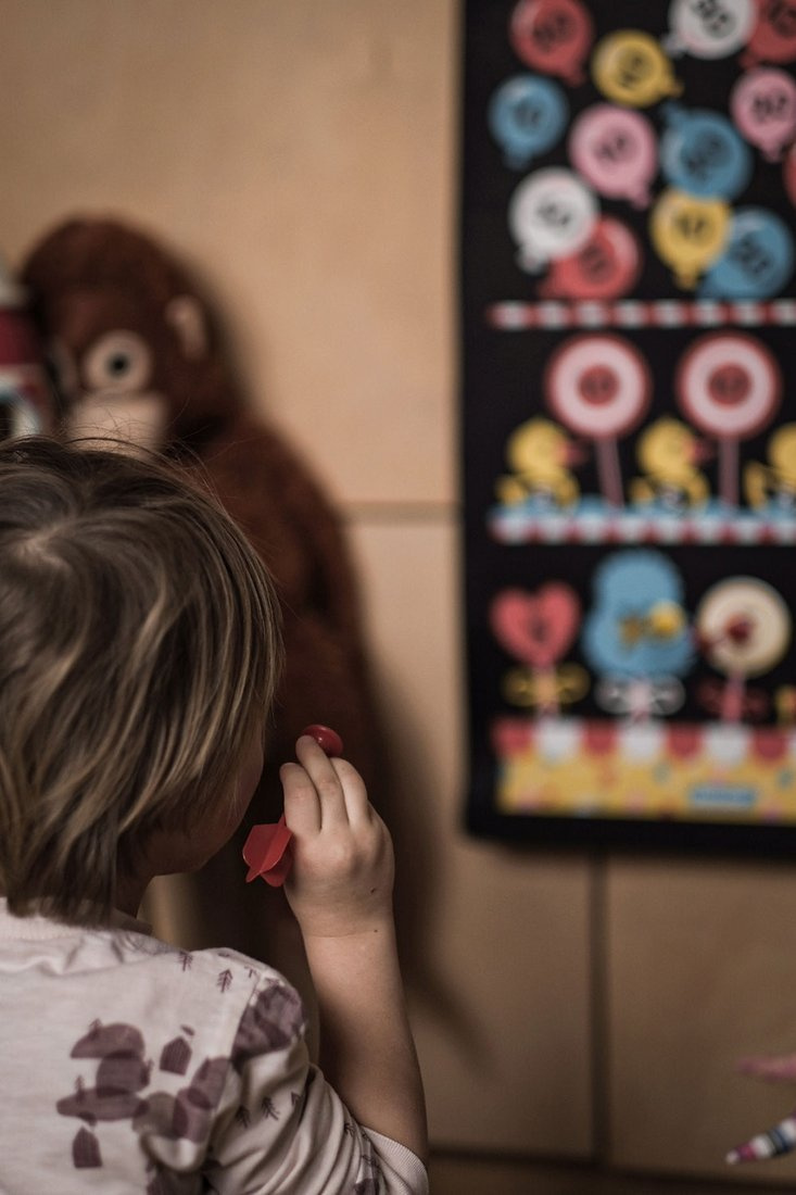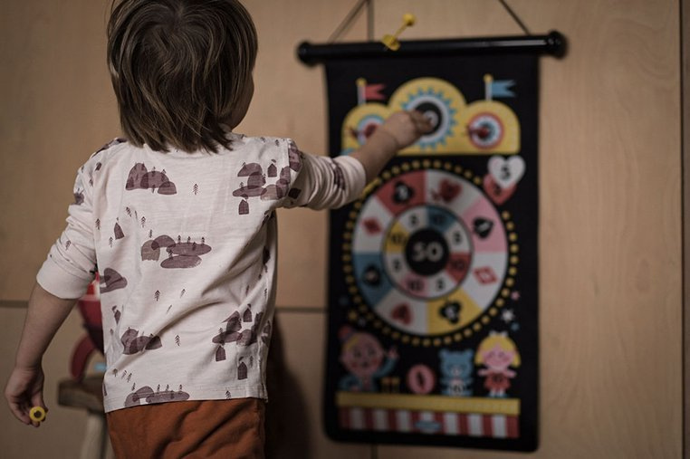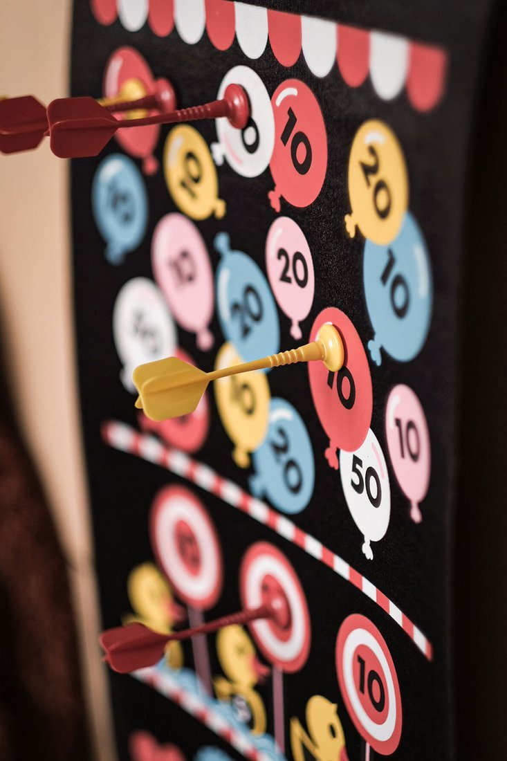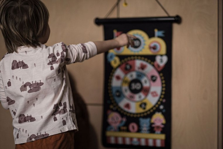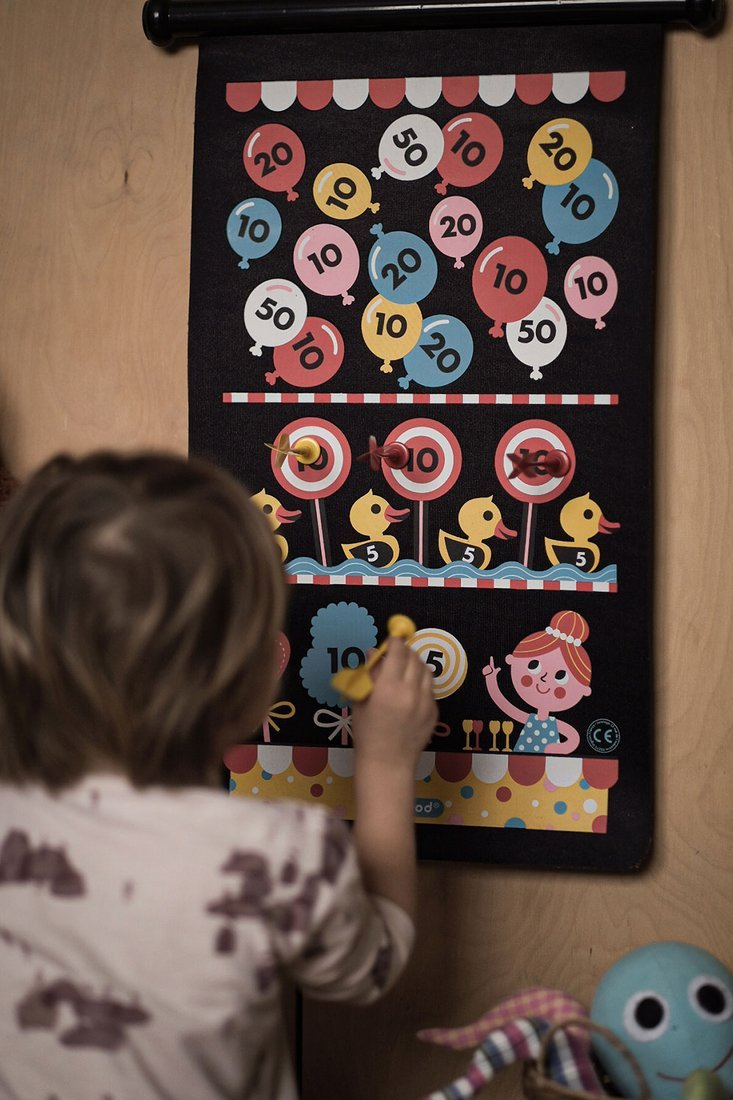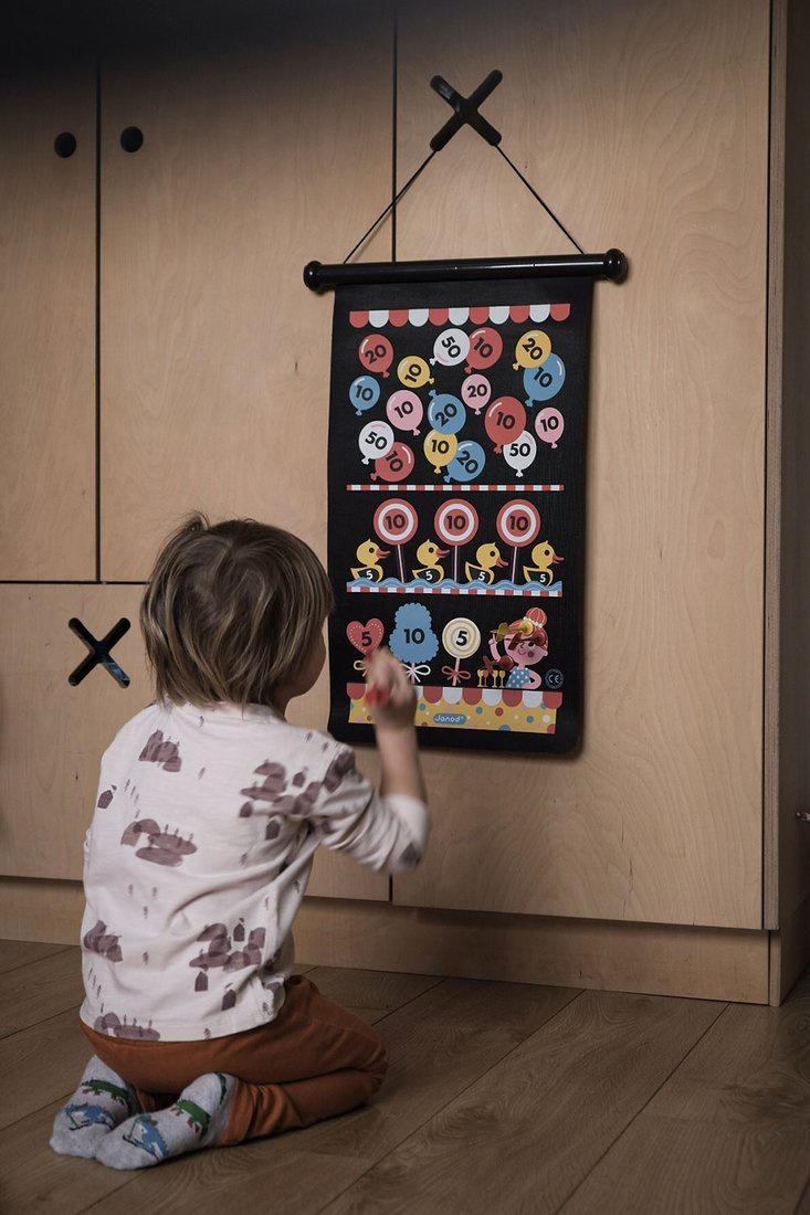 Magnetyczna gra w rzutki Wesołe miasteczko francuskiej marki JANOD to wspaniała zabawa dla dwojga – zarówno dzieci, jak i ich rodziców. Zestaw składa się ze zwijanej na rolkę tarczy ze sznurkiem do jej zawieszenia, np. na ścianie, oraz z 6 magnetycznych rzutek w dwóch kolorach (3 czerwone i 3 żółte). Czarna tkanina tarczy ilustrowana jest dwustronnie kolorowymi motywami typowymi dla strzelnicy z wesołego miasteczka, m. in balonami, kaczuszkami czy kołem fortuny. Rzutkami należy celować w tarczę z odpowiedniej, ustalonej przez graczy odległości, w taki sposób, by trafić w oznaczone na niej punktowane miejsca. Celem gry jest zgromadzenie w trzech rzutach jak największej ilości punktów. Gracz, któremu się to uda, wygrywa. Gra ta ćwiczy koncentrację i zręczność.