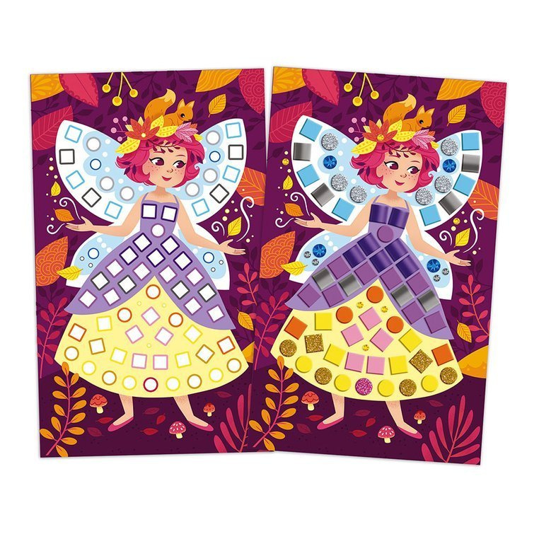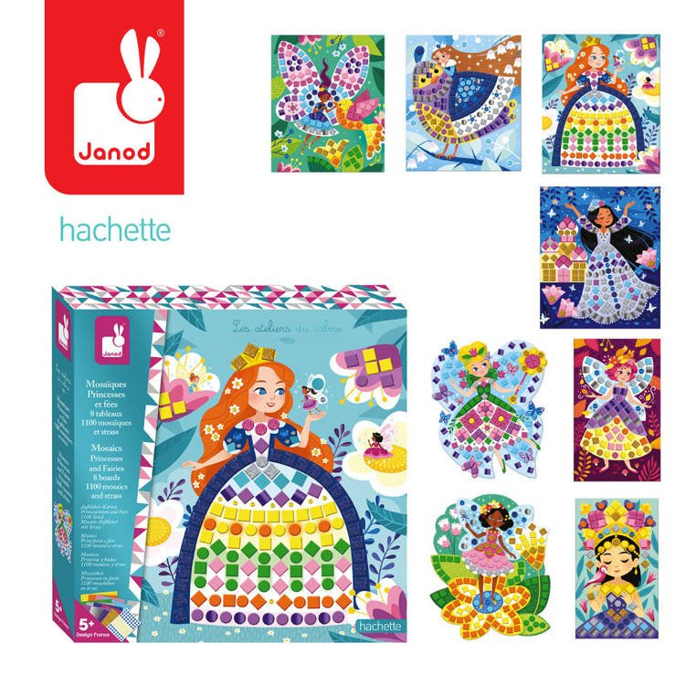 Zestaw kreatywny Mozaika Księżniczki i wróżki francuskiej marki JANOD zawiera 8 kartonowych plansz-obrazków, które przedstawiają piękne dziewczyny – skrzydlate wróżki na łonie przyrody i księżniczki w balowych sukniach. Do ilustracji tych można – zarówno w sugerowanych miejscach, jak i dowolnie – przyklejać dołączone do zestawu kryształki w 3 wielkościach i kolorach oraz drobne kwadratowe i okrągłe piankowe naklejki (w sumie ponad 1000 elementów!) w rożnych kolorach, umieszczone na 12 arkuszach, w tym 4 z efektem połysku. W komplecie znajdują się 4 samoprzylepne zawieszki. Naklejanie to dla dziecka długie godziny angażującej i jednocześnie uspokajającej, wyciszającej zabawy, a gotowe obrazki staną się wspaniałym elementem dekoracyjnym dziecięcego pokoju.