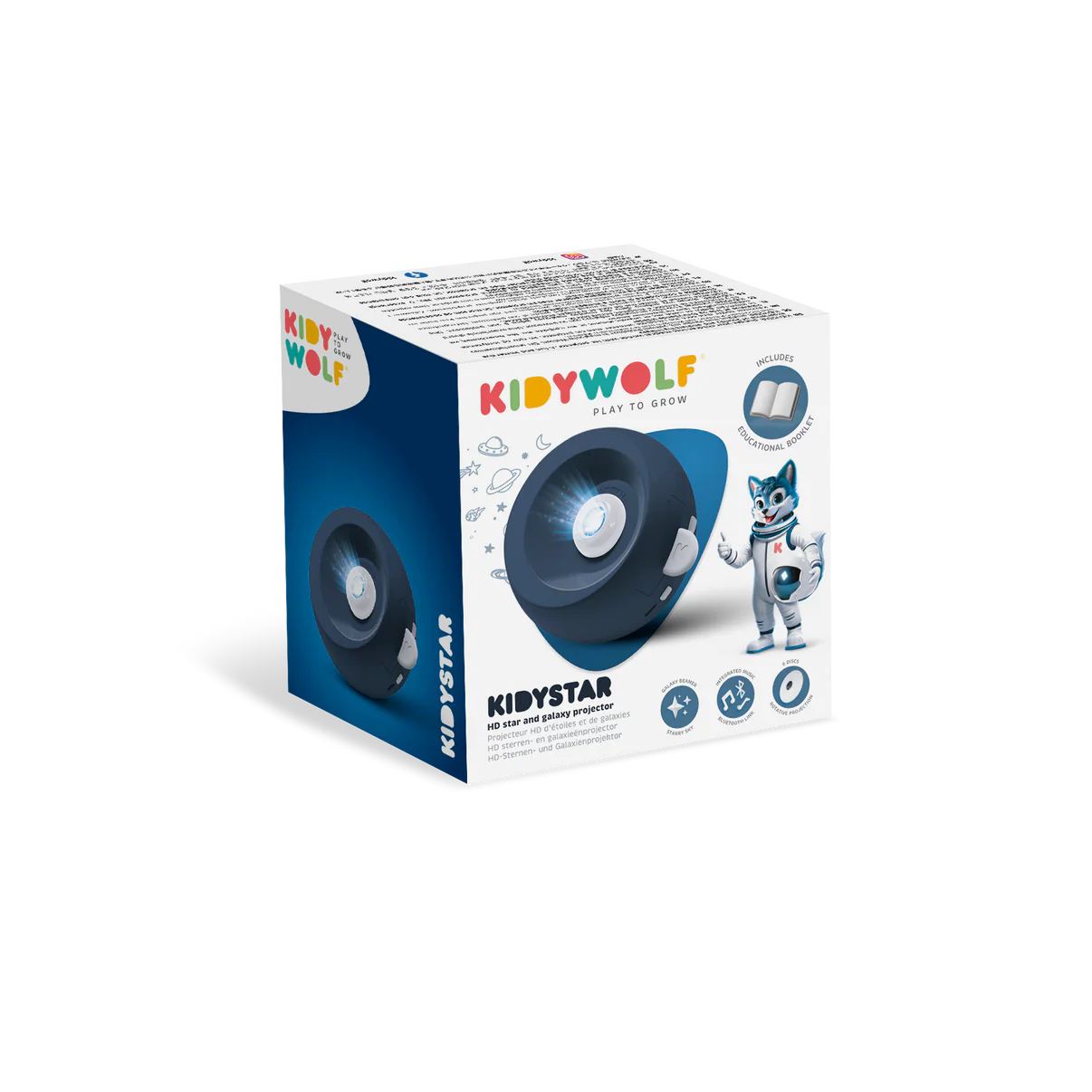Wprowadź magię do pokoju swojego dziecka z KIDYSTAR! Ten czarujący projektor zamieni ściany i sufity w urzekający pokaz świetlny dzięki sześciu wymiennym płytom. Ilustrowana broszura edukacyjna pobudza ciekawość i koi umysły przed snem. Zaproszenie do wyciszenia, marzeń i odkryć… na noce pełne słodkich snów.