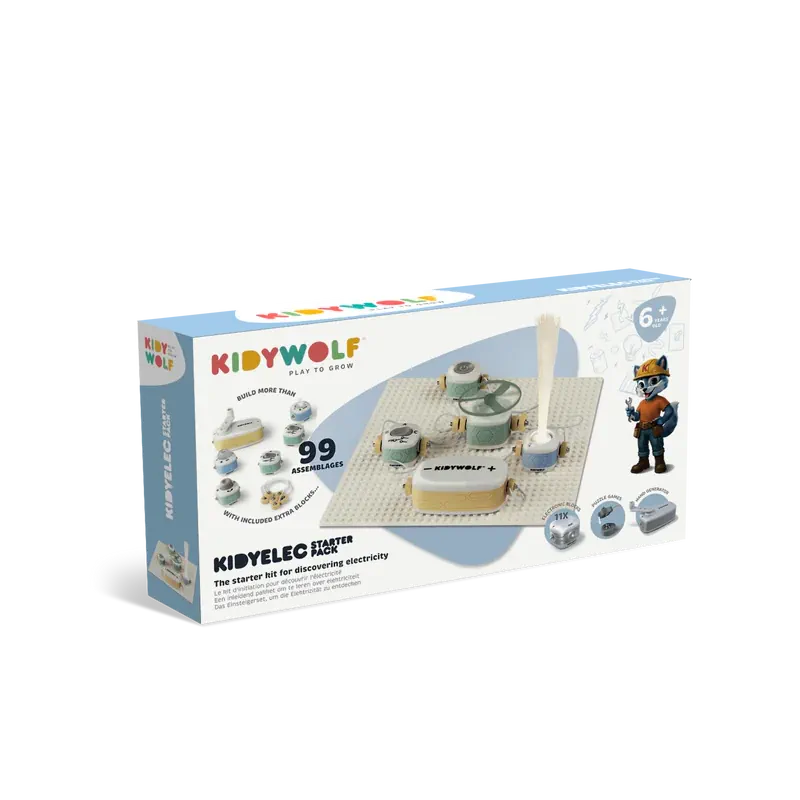 Zestaw KIDYELEC STARTER od belgijskiej marki Kidywolf to idealne wprowadzenie w świat elektryczności dla najmłodszych odkrywców. Dzięki prostym elementom do łączenia, kolorowym komponentom i intuicyjnym instrukcjom, dzieci w wieku od 6 lat mogą samodzielnie budować pierwsze obwody, testować swoje pomysły i odkrywać, jak działa prąd elektryczny.