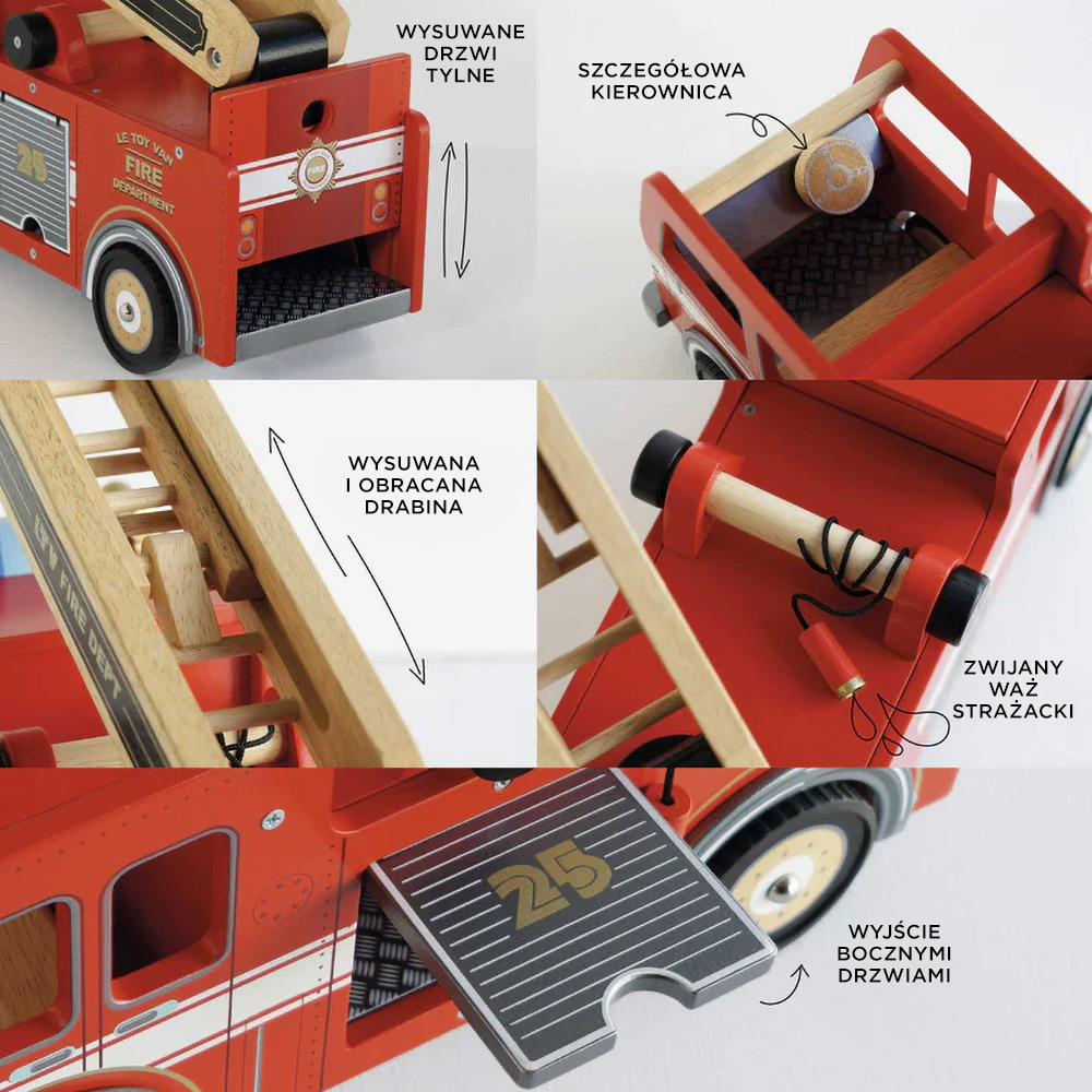 Ta trwała zabawka została wykonana z drewna pochodzącego ze zrównoważonych zasobów pomalowanego pięknym czerwonym kolorem przy użyciu bezpiecznych dla dzieci farb. Wóz ma wysuwaną drabinę, wąż strażacki i otwierany dach, dzięki czemu aspirujący strażacy będą cieszyć się całodniową zabawą, jednocześnie doskonaląc sprawność motoryczną i rozwijając wyobraźnię.