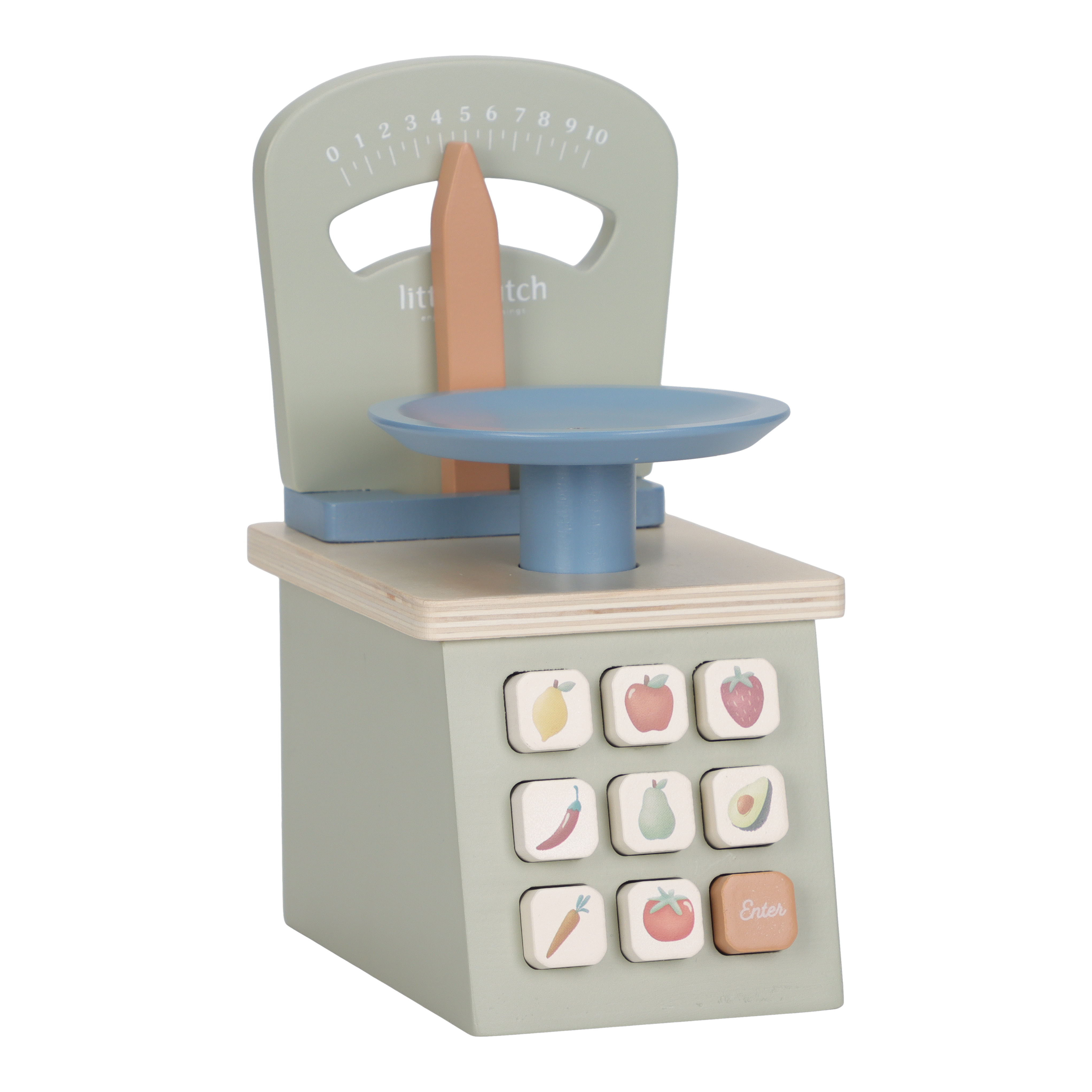 Zabawkowa waga nie tylko świetnie nadaje się do zabawy w udawanie, ale także pomaga rozwijać umiejętności społeczne, motoryczne i wyobraźnię Twojego malucha. Zabawę świetnie uzupełni zestaw z deską do krojenia z owocami lub warzywami, drewniana kasa czy drewniana kuchnia marki Little Dutch. Świetny pomysł na prezent dla trzylatka.