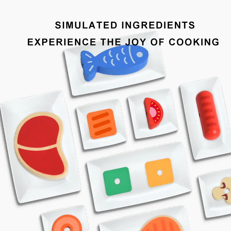 • Zestaw zawiera: bazę pod grill, płytę grillową, 21 części w kształcie jedzenia, 3 części w kształcie przypraw, 5 części w kształcie węgielków, dwa patyczki do szaszłyków, szczypce i deskę
