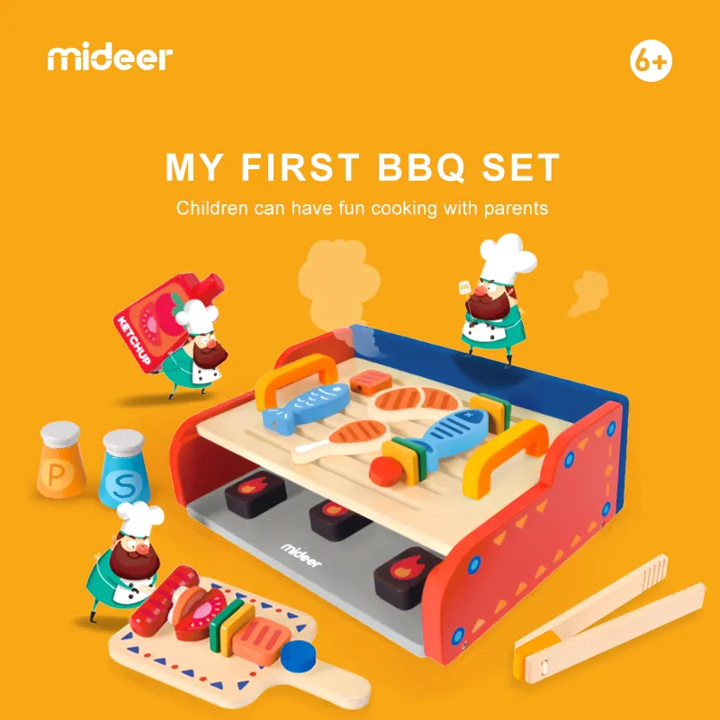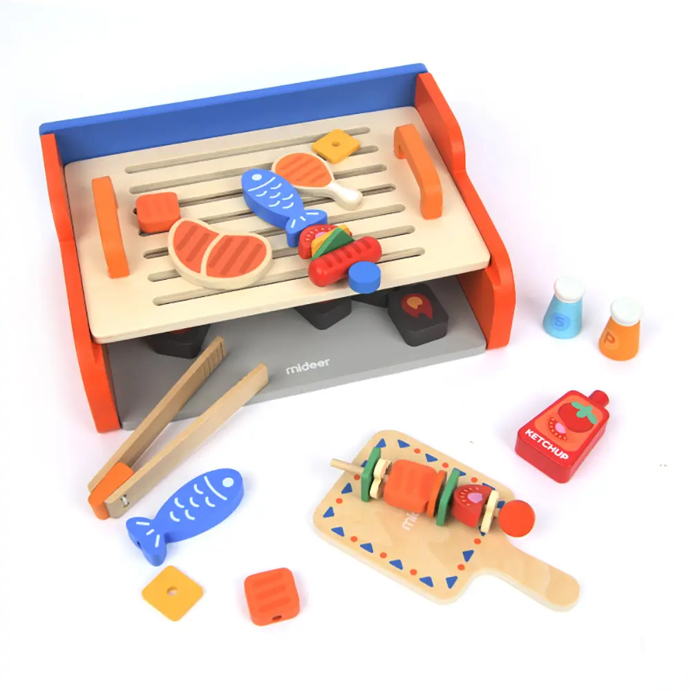 Czy to już Majówka? Niekoniecznie, ale na pewno pora odpalić grilla! Drewniany zestaw grillowy dla dzieci pozwoli im poczuć się jak profesjonalni szefowie kuchni, dbający o swoich gości w ciepły, letni dzień. Zabawa zachęca do kreatywności, nauki nowych smaków i kolorów, a także rozwija zdolności poznawcze. Wszystkie elementy są wykonane z litego drewna, bez ostrych krawędzi. Drewno zostało pokryte nietoksycznymi farbami i spełnia wszystkie europejskie normy bezpieczeństwa.