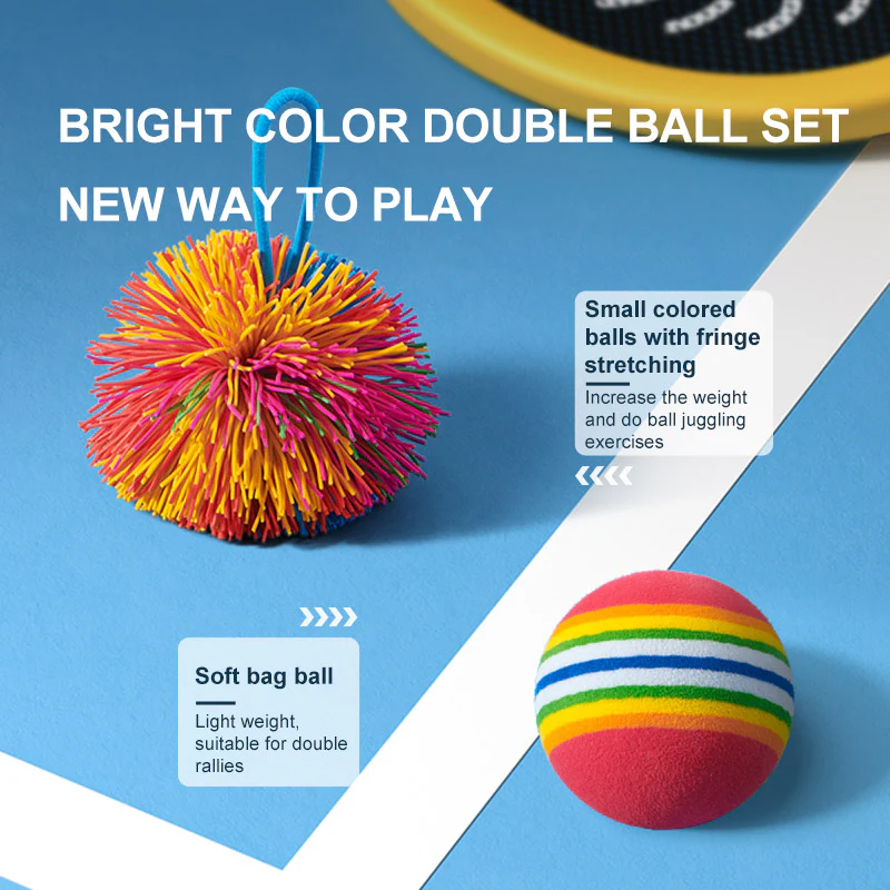 - Zawartość zestawu: 2 rakietki, 1 kolorowa piłka jeżyk, 1 miękka piłka tęczowa