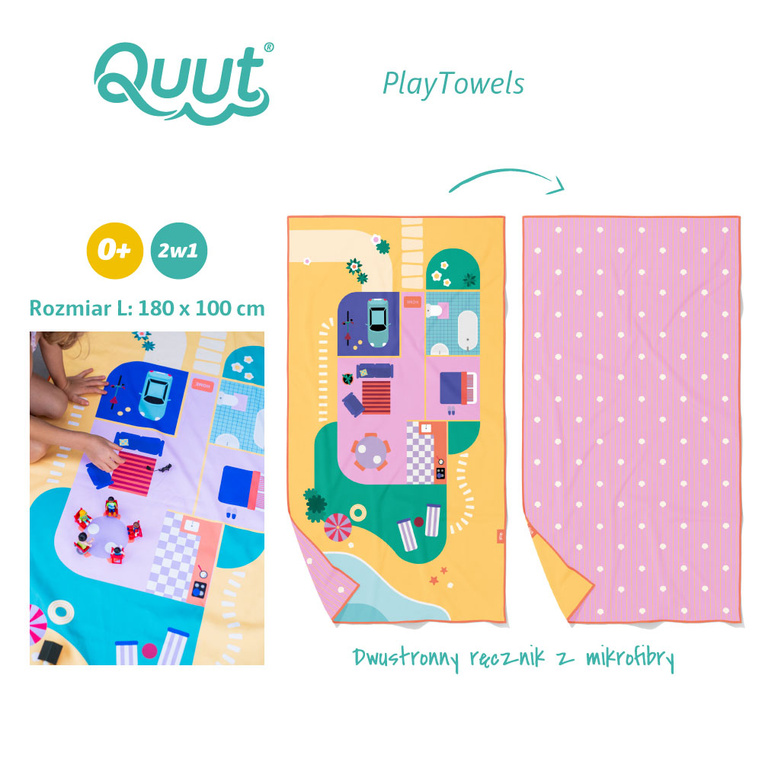 Dwustronny ręcznik plażowy PlayTowels Doll house belgijskiej marki Quut to praktyczne i rozwojowe rozwiązanie dla aktywnych maluchów. Sprawdzi się zarówno jako klasyczny, szybkoschnący ręcznik plażowy oraz jako mata do zabawy. Jedną ze stron zdobi atrakcyjny wzór graficzny, a drugą – przepiękny domek dla lalek w rzucie, stanowiący gotową, inspirującą scenerię do kreatywnej zabawy.