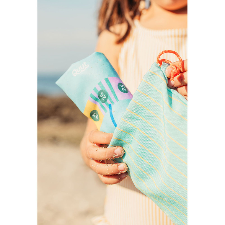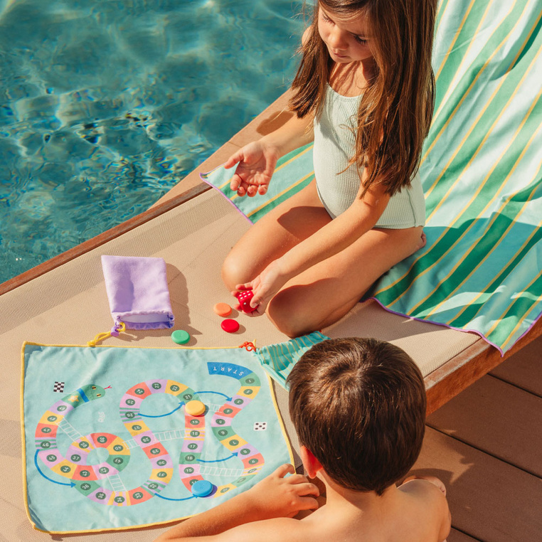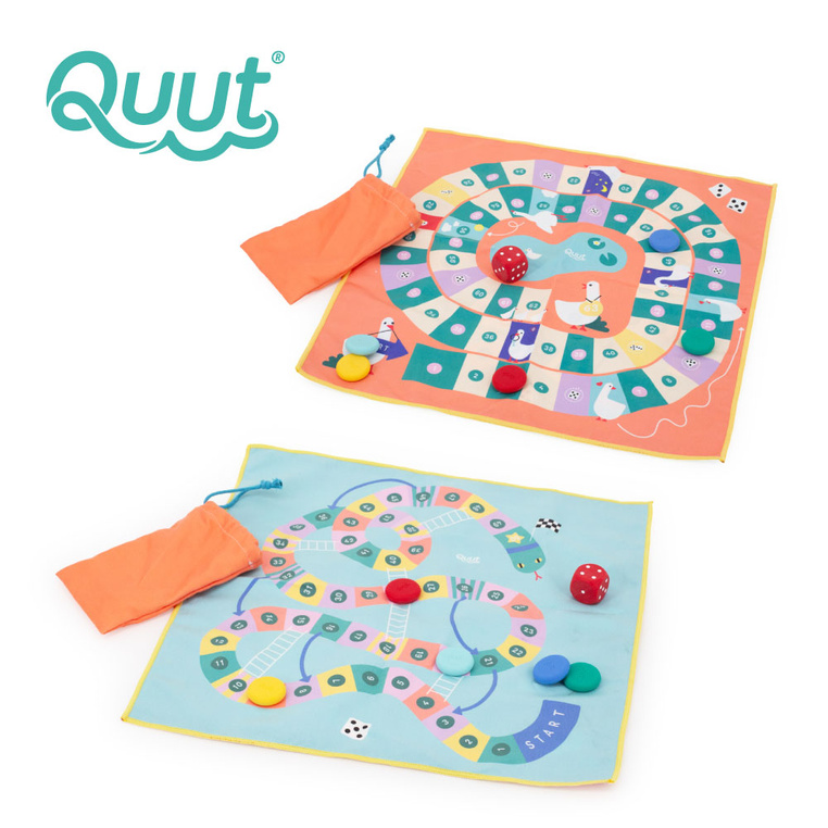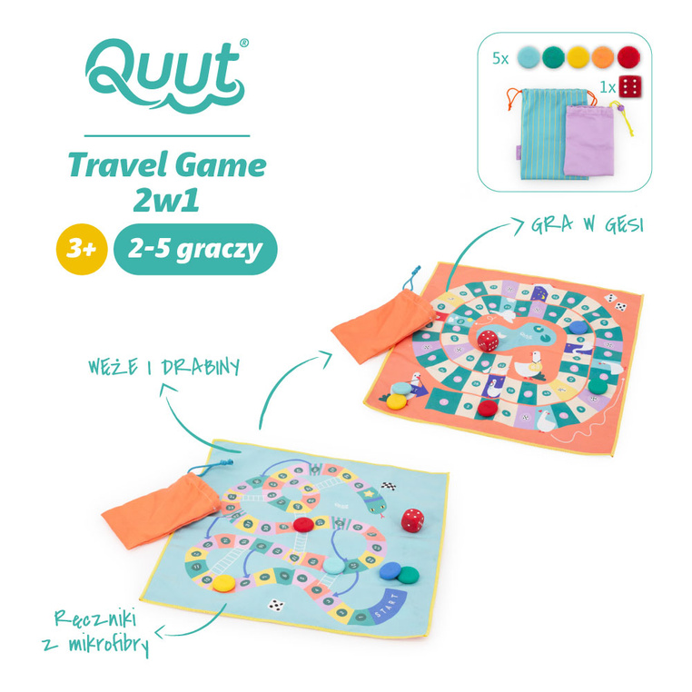 Podróżny zestaw gier 2w1 Węże i Drabiny oraz Gra w Gęsi belgijskiej marki Quut to dwie ponadczasowe gry rodzinne w nowoczesnym, podróżnym wydaniu. Zestaw obejmuje dwustronną planszę z szybkoschnącej mikrofibry, 5 silikonowych pionków i kostkę – wszystkie elementy są odporne na wodę i piasek, dzięki czemu zabawa sprawdzi się wszędzie: w domu, w podróży, na plaży czy przy basenie.