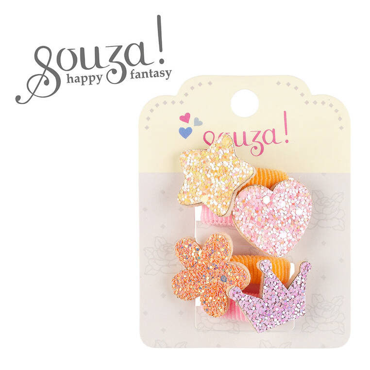 Komplet czterech gumek do włosów z brokatowymi kształtami Carolina holenderskiej marki Souza! Na każdej z nich znajdują się aplikacje w różnych kolorach i kształtach: żółta gwiazda, jasnoróżowe serce, pomarańczowy kwiat i jasnofioletowa korona. Gumki są solidne, typu frotte, dwie są ciemnożółte i dwie różowe. Idealne zarówno do tworzenia fryzur na przyjęcia, jak i na co dzień. Nadają się także na prezent.